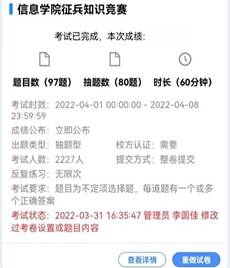 此次答题活动,将我国《兵役法》、《征兵工作条例》、《2022年大学生征兵工作实施方案》、《国防教育法》和《2022年大学生应征入伍相关优待政策》灵活地融入到征兵知识考题之中。采取不定项选择的题型,同学们积极备考、认真答题,共计2227名学生参赛,其中2068人取得70分以上(总分80分)的成绩,参与率达92%。(颜聪玲供稿)