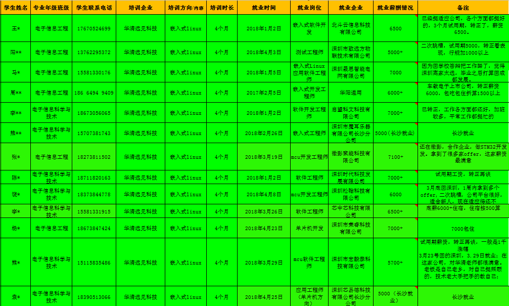 华清远见紧跟IT技术潮流,我们的实训实战项目已经走在大部分研发企业的前列,我们的学员毕业时候具备的职业素质,正是各个企业最想招聘到的人才所需具备的专业知识和技能;在刚刚过去的2017年,参加深圳华清远见岗前实训实习的嵌入式物联网,人工智能方向和JAVAEE方向的同学都取得了骄人的就业成绩,深圳华清远见嵌入式物联网方向的就业很理想,在2017年深圳华清远见凭借自己的强大的专业水平,凭借师资的多年的教学和研发经验和强大的就业指导团队,在深圳华清远见嵌入式物联网方向学习的2017届同学,我们的近期就业数据显示,应届毕业生,入职转正嵌入式工程师的月平均薪酬为7088元. 这个就业的质量在同行的各个培训公司中名列前茅。