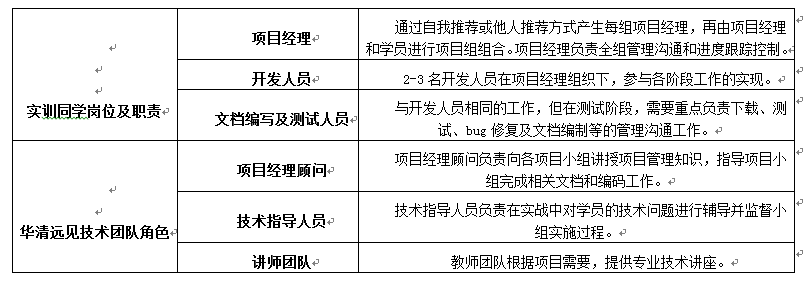 根据实训项目特点,我们队实训参加实训的同学进行分组,一个项目组由3-6名同学以及华清远见技术支持团队组成,在指定时间内完成项目分析、设计、编码、测试等项目开发工作。其实训项目人员配置如下: