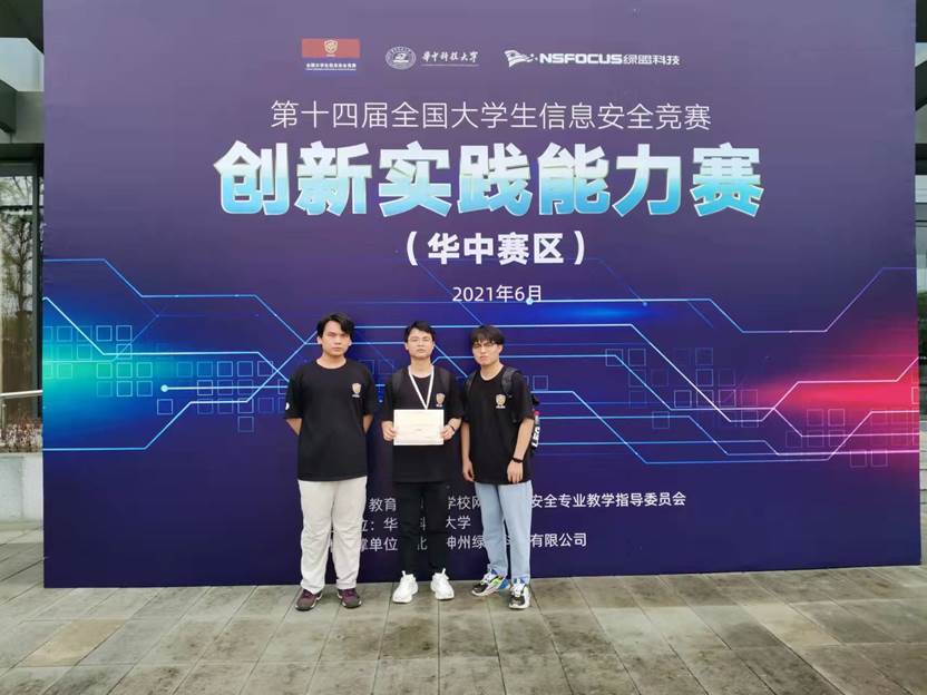 为积极响应国家网络空间安全人才战略,推动网络空间安全人才培养,信息学院网络工程专业积极组织学生参加了第十四届全国大学生信息安全竞赛——创新实践能力赛(以下简称大赛")。大赛面向全国高校在校生开放,于20214月启动报名,5月进行了线下初赛。网络工程专业组织了8支参赛队参加了初赛,其中有2支队脱颖而出,进入华中赛区赛。626-27日,华中赛区(河南、湖南、湖北)赛在武汉市国家网络安全人才与创新基地举行。我院学生付丹诚、彭春森、唐少雄、孙成心同学(指导老师:李曾妍)在华中赛区赛的激烈竞争中喜获三等奖,实现了beat365在此项赛事上省级奖项的零的突破。(供稿人:李曾妍)