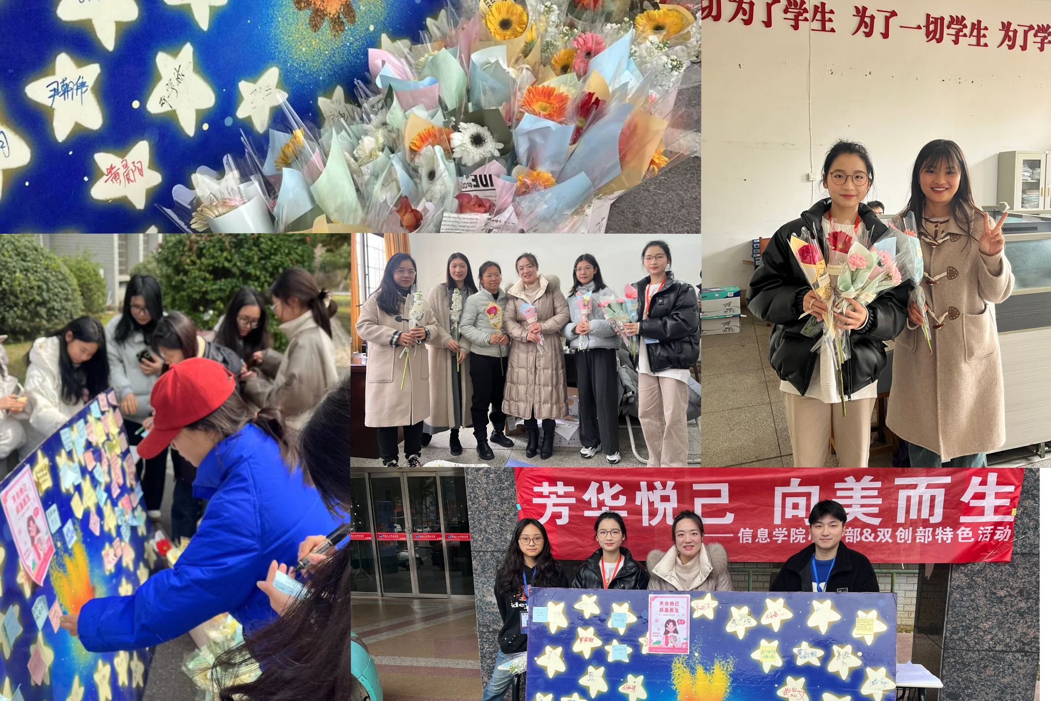 在春暖花开之际,信息学院2024年3月7日在百全楼门口,举行了第三届“花样年华”女生节之“芳华悦己,向美而生”主题的心理特色活动。