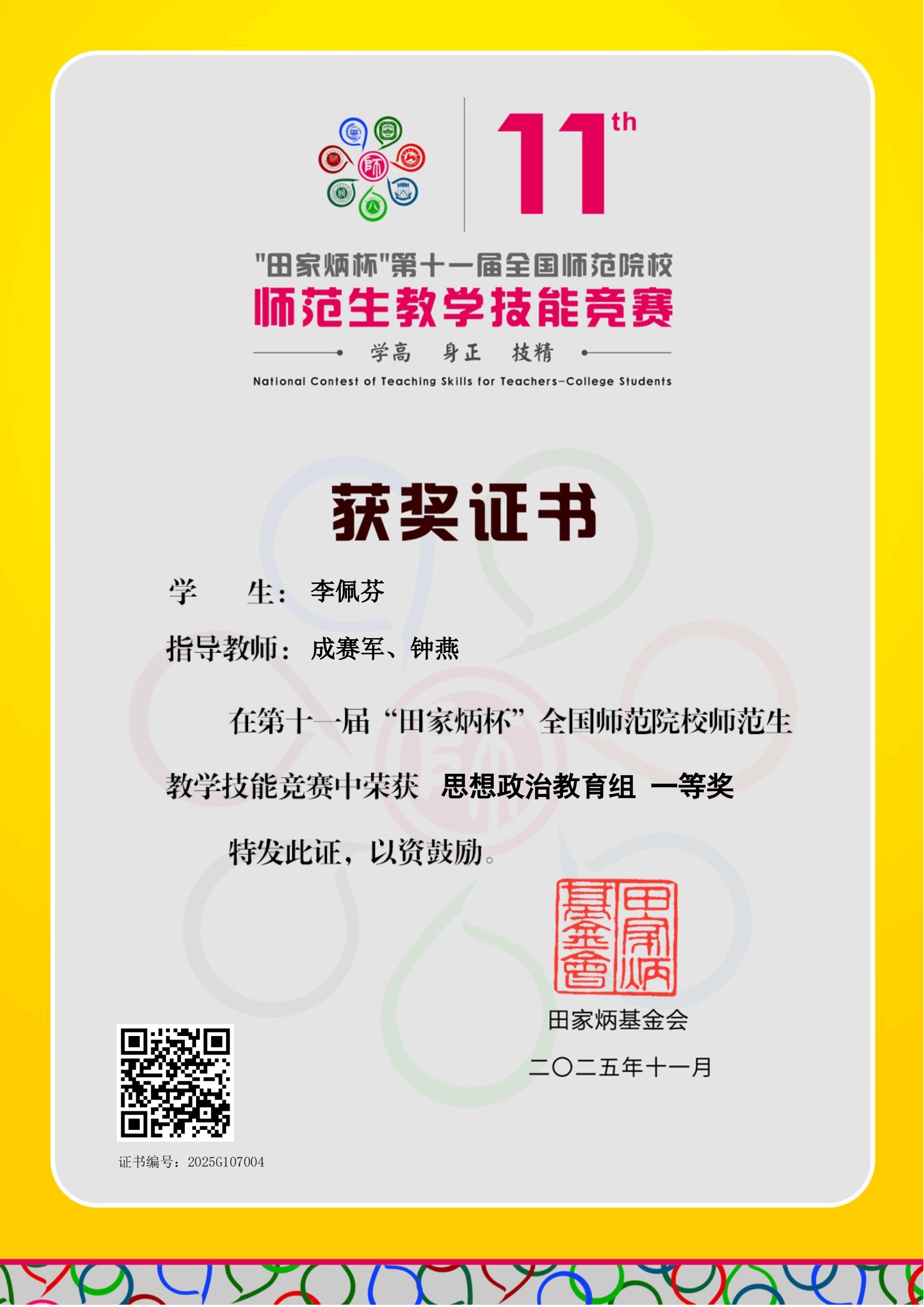11月30日,第十一届“田家炳杯”全国师范院校师范生教学技能竞赛决赛圆满落幕。beat365马克思主义学院李佩芬同学凭借扎实的专业素养与出色的教学表现,在比赛中脱颖而出,荣获一等奖,彰显了学校在思政师范人才培养方面的显著成效。