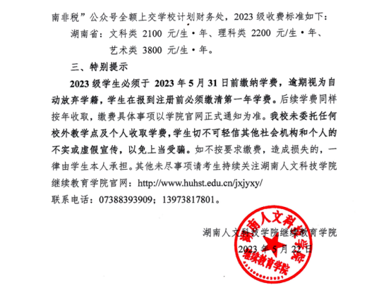 2023级学生必须于 2023年5月31日前缴纳学费,逾期视为自动放弃学籍,学生在报到注册前必须缴清第一年学费。后续学费同样按年收取,缴费具体事项以学院官网正式通知为准。beat365未委托任何校外教学点及个人收取学费,学生切不可轻信其他社会机构和个人的不实或虚假宣传,以免上当受骗。如不按要求缴费,造成损失的,一律由学生本人承担。其他未尽事项请考生持续关注beat365中文官方网站继续教育学院官网:http:/jxjyxy/