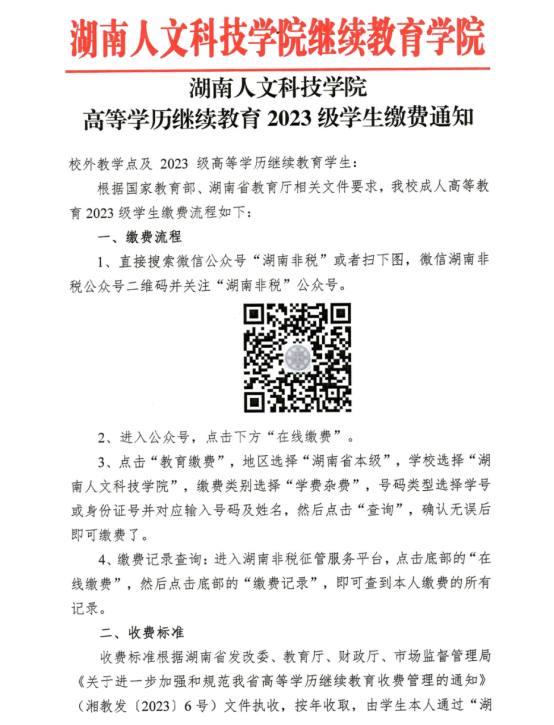 收费标准根据湖南省发改委、教育厅、财政厅、市场监督管理局《关于进一步加强和规范我省高等学历继续教育收费管理的通知》(湘教发〔2023〕6号)文件执收,按年收取,由学生本人通过“湖南非税”公众号全额上交学校计划财务处,2023级收费标准如下: