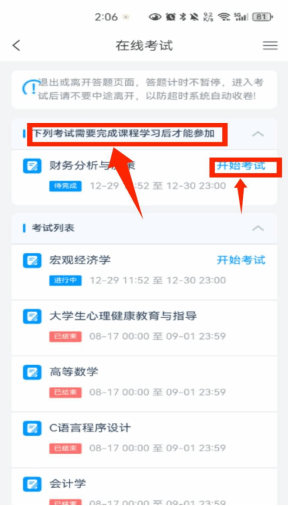 4、学习任务未完成的课程,会显示在下图所示列表中。须完成课程学习任务后才能参加考试,点击开始考试将弹出提示语。