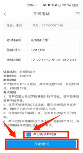 3.课程学习任务完成的,可直接进入考试点击“开始考试”阅读考试说明之后——勾选“我已阅读并同意”——点击“开始考试”。