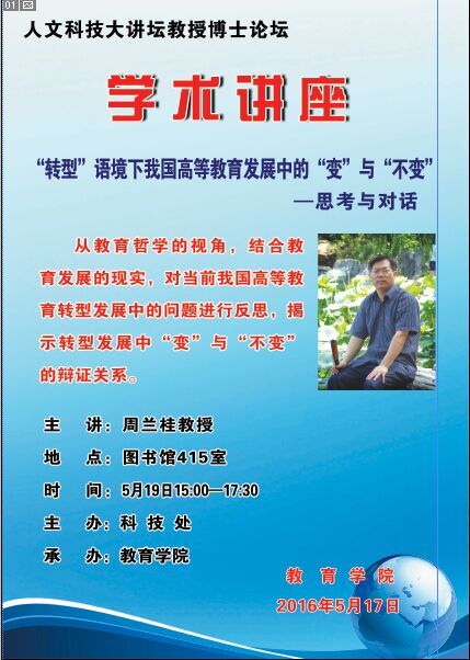 2016519日下午15:00——17:00,教育学院在学校图书馆415会议室举办了一场人文科技大讲坛教授博士论坛,主讲人为教育学院教授周兰桂,讲座主题为——《“转型”语境下我国高等教育发展中的“变”与“不变”——思考与对话》。前来听取讲座的有来自各兄弟学院、学校教务处等职能部门的专家教授、领导和部分学生代表。