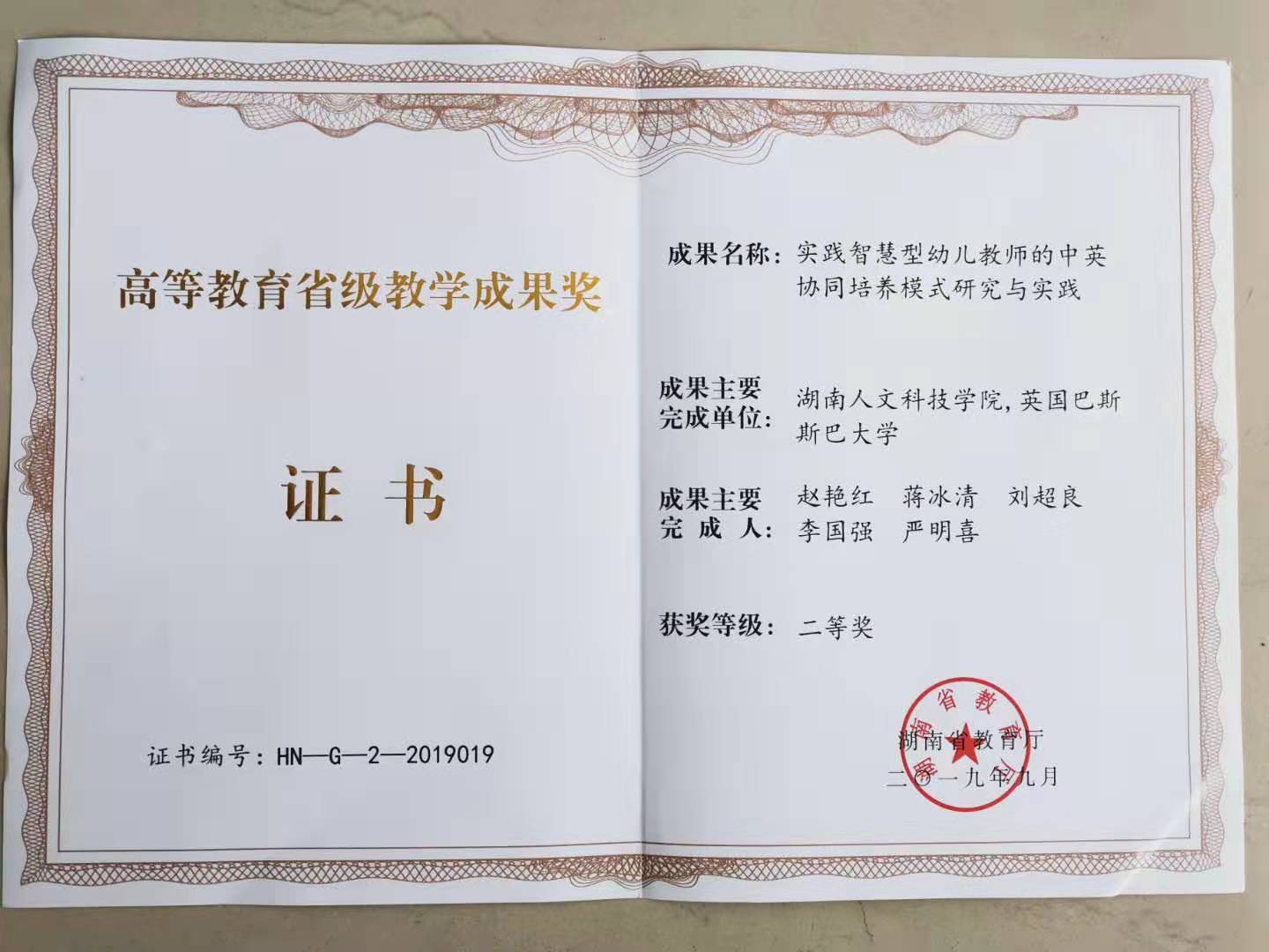 湖南省第十二届高等教育教学成果奖评奖已于9月23日揭晓,我院赵艳红博士主持、蒋冰清教授、刘超良教授、李国强教授、严明喜副教授等人参与的教改项目“实践智慧型幼儿教师的中英协同培养模式研究及实践”荣获二等奖。这是我院教师在学前教育专业教学改革方面经过多年努力所取得的一项创造性成果。这一成果的取得,将激励我院广大教师投身教研教改、潜心教书育人、更好落实立德树人根本任务、努力提高人才培养质量。(院教务办供稿)