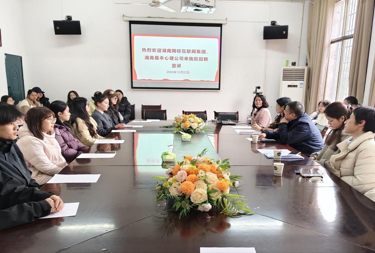 为了精准对接应用心理学专业学子的就业需求、搭建校企人才的合作桥梁,12月22日下午,教育学院联合湖南网标互联网集团、湖南易禾咨询有限公司在甘澍楼304教室开展了面向2026届全日制本科应用心理学专业应届毕业生招聘宣讲会。参会人员有王旭红老师、辅导员陈福以及应用心理学专业学生。