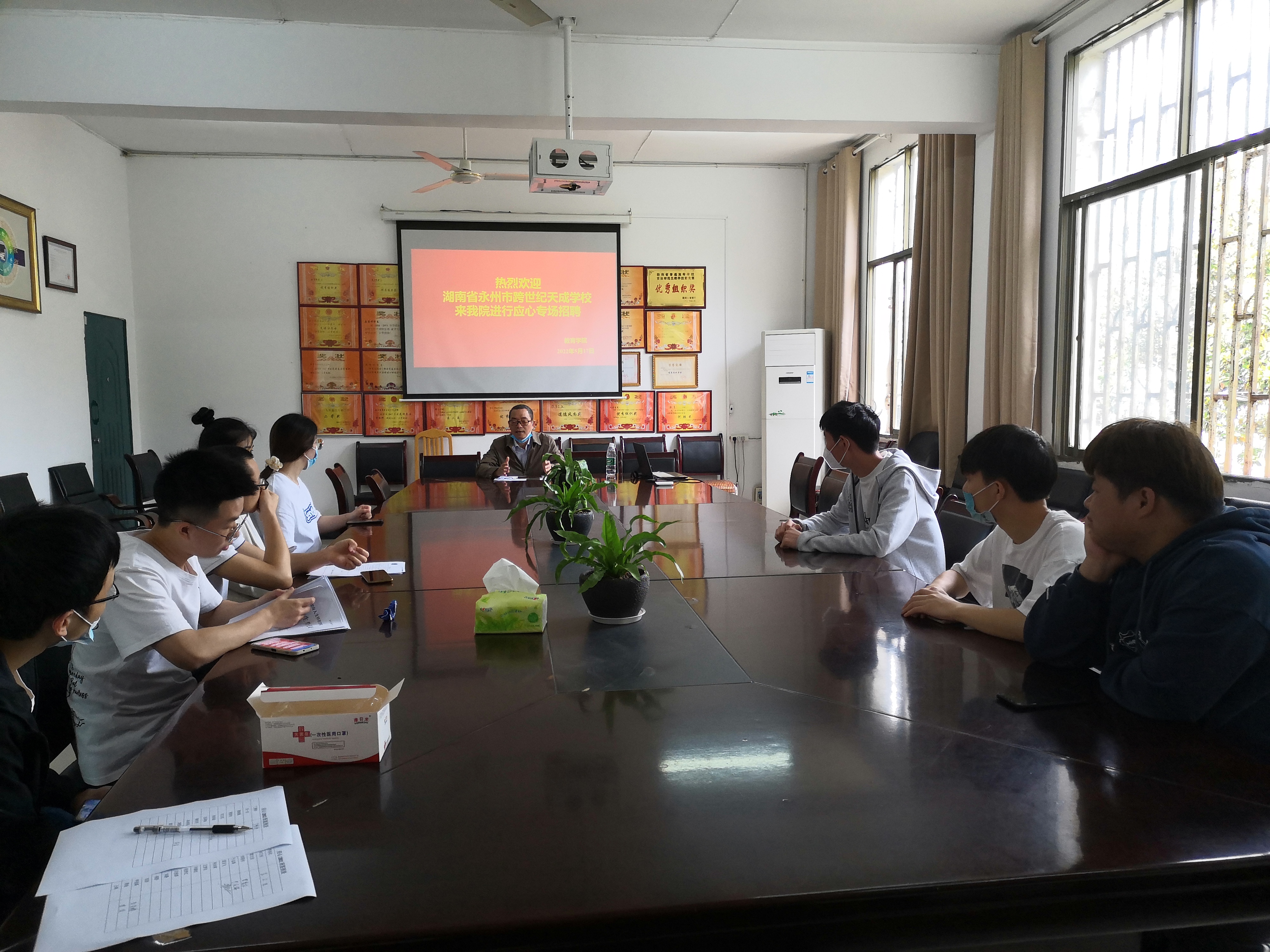 5月17日,教育学院2022届应心、人教毕业生专场招聘会于甘澍楼304举行。此次前来招聘的是耒阳市慈晖学校和永州市跨世纪天成学校相关负责人。学院党总支副书记田密、辅导员梁鑫、黎任水以及部分18、19级学生参加会议。