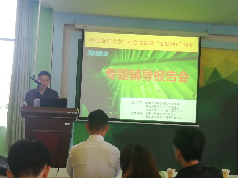 5月17日,我院联合校企合作单位,在甘澍楼共同举办了“校企合作大学生社会实践暨‘互联网+’创业专题辅导报告会”。此次报告会是应用心理学专业校企合作课程(三)的活动内容之一,得到了湖南正阳大学生创业基金会、娄底市娄星区司法局、娄底市善行天下社工服务中心、娄底创客管理有限公司、娄底正阳电子商务有限公司的支持与配合。报告会的大部分听众为我院16级应用心理学专业学生,我院党总支部副书记李霞、实验实训室刘红平等老师出席了报告会。报告会由徐建东副教授主持。