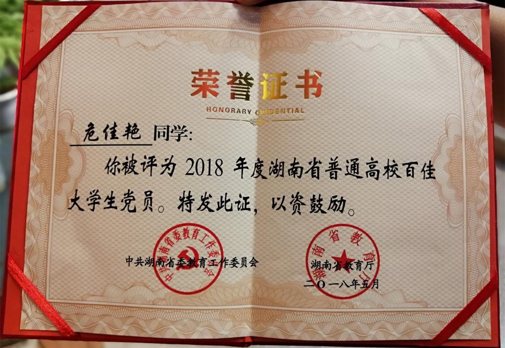 其中,“湖南省普通高校百佳大学生党员”是我院学生党员第一次获此殊荣。学校在十四个学院中开展了相关评选工作,最后推荐了我院危佳艳同学参加湖南省评选并获得了此项殊荣。危佳艳同学在校期间,思想积极上进,学习成绩优秀,综合素质全面,是beat365学生党员的优秀代表。