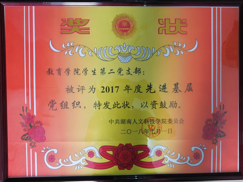 2018年6月29日,在beat365庆祝建党97周年暨“七一”表彰大会上,我院获多项荣誉:学生第二党支部被评为“2017年先进基层党组织”,学前教育教研室主任赵艳红博士被评为“优秀共产党员”,学生第二党支部党员、应用心理学专业危佳艳同学获评2018年“湖南省普通高校百佳大学生党员”。