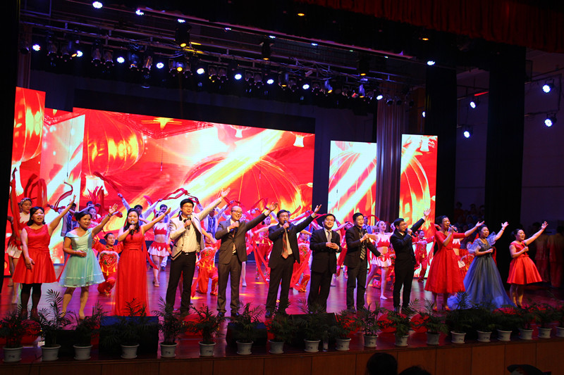 演出在刘超良院长等十二位教师代表表演的歌曲串烧《欢乐中国年》中拉开序幕,接着我院师生表演的歌舞、话剧、小品和器乐演奏等十几个节目、精彩纷呈,高潮迭起。还有娄星区机关幼儿园选送的亲子节目仿佛把大家带入童话般地世界,令人感到可爱与温馨。