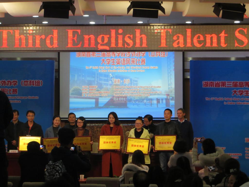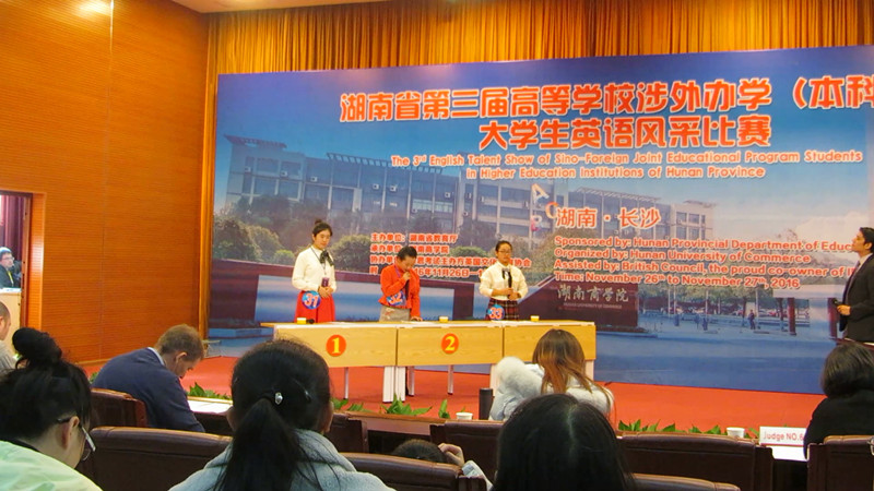 11月26至27日,湖南省第三届高等学校涉外办学(本科组)大学生英语风采赛在湖南商学院举行,赛事由湖南省教育厅举办、湖南商学院承办、雅思考试主办方英国文化教育协会协办。湖南省教育厅党组成员王玉清出席比赛。来自中南大学、湘潭大学、长沙理工大学、湖南商学院等16所高校的17支代表队,共聚一堂,切磋较量。beat365与英国巴斯斯巴大学合作开办的学前教育专业中英合作本科教育项目代表队首次参加本项竞赛(3位正式选手、5位助演)。