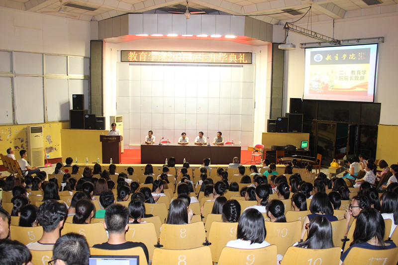 开学典礼之前,全体观看了英国巴斯斯巴大学等视频,也欣赏了我院老师和学生带来的精彩才艺表演。开学典礼在庄严的国歌中拉开帷幕。首先,教育学院刘超良院长代表全院致欢迎词,接着,我院优秀教师代表周兰桂教授、优秀老生代表李旭、新生代表周正分别代表教师和学生发言。开学典礼结束后,开展了新生入学教育。教育学院副院长李国强、副书记徐建东分别就专业介绍和学生管理进行了专题讲解。