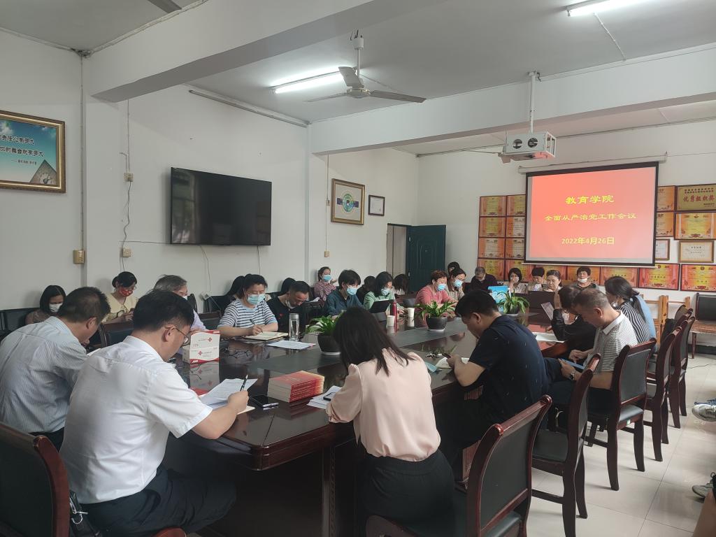 4月26日下午,教育学院在甘澍楼304会议室召开2022年全面从严治党暨学院工作会议。院长刘超良主持会议,党总支部书记邹坤,副院长曹俊军,副书记田密及全体教职员工参加会议。