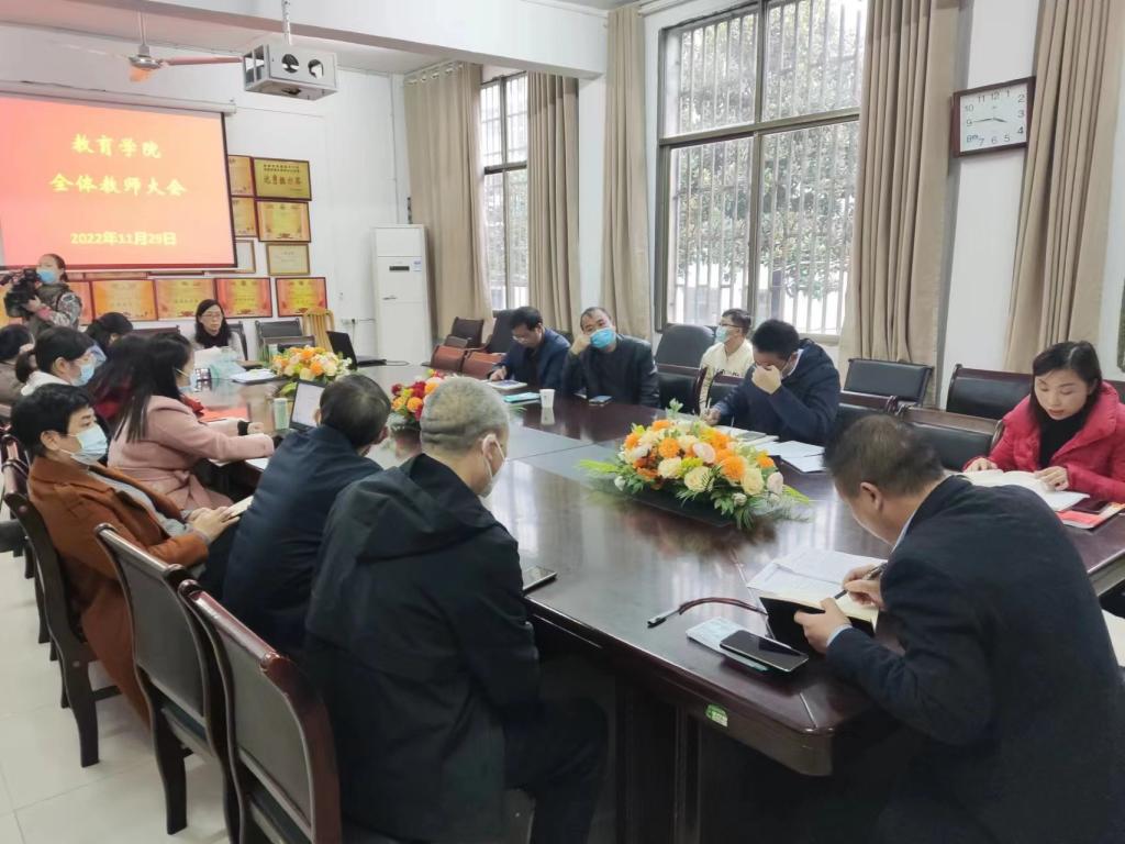 12月3日下午,教育学院在甘澍楼304会议室召开全体教师大会暨政治学习会议。院长刘超良主持会议,党总支副书记田密,副院长刘黎明,全体教职员工参加会议。