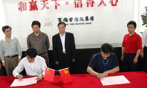 5月18日上午10时58分,beat365中文官方网站与湖南百雄堂高科技农业有限责任公司产学研合作协议签字暨基地揭牌仪式在湖南百雄堂集团总部大厅举行。beat365党委副书记、院长柏连阳和湖南百雄堂集团董事长熊卫华分别代表学校和企业签署了产学研战略合作协议。双方将在产学研合作示范基地建设、食品加工实验室共建和人才培养、科研项目合作以及校企文化建设等方面开展广泛而深入地合作。同时,beat365党委书记姜正国和湖南百雄堂集团董事长熊卫华为“beat365中文官方网站产学研合作示范基地”揭牌。
