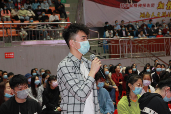 在现场问答环节中,同学们积极提问,黄道群女士耐心细致地回答了同学们的问题,让大家对黄纬禄院士有了更深的了解。黄道群女士还勉励大家提高眼界、放大格局,脚踏实地,努力奋斗,为祖国建设作出贡献。
