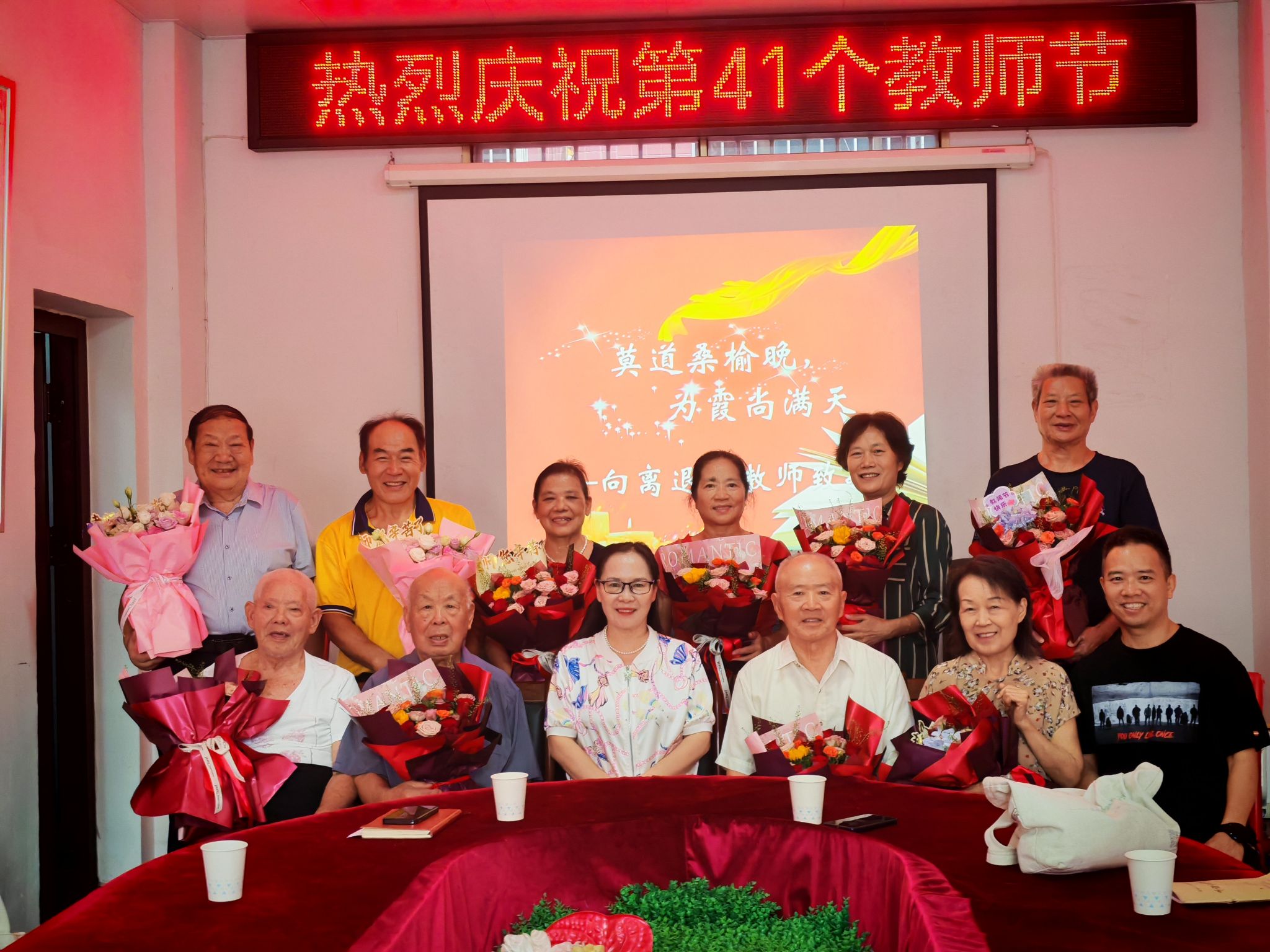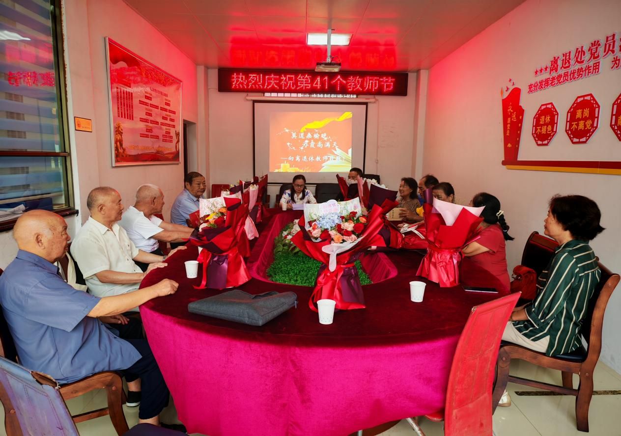 座谈会现场温馨而热烈。会场内悬挂祝福标语,桌上摆放着清茶与鲜花,处处洋溢着尊师重教的浓厚氛围。
