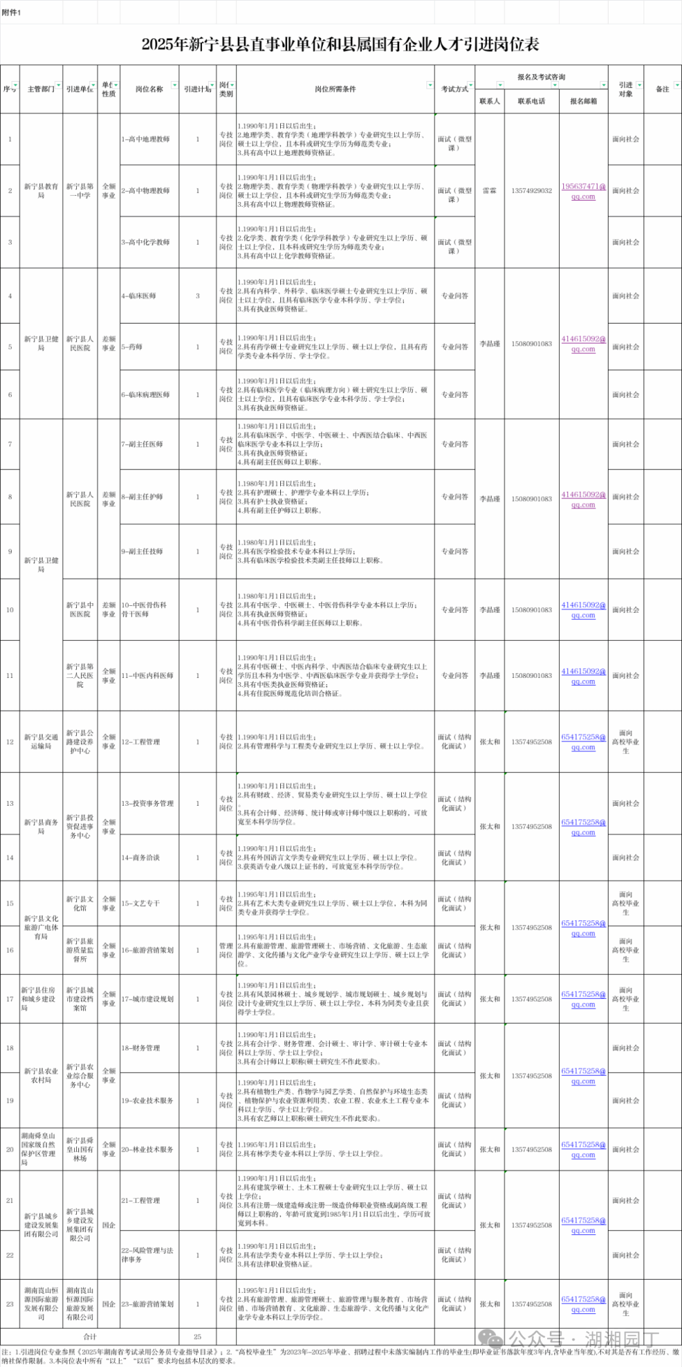 本次人才引进计划共25名(其中事业编制计划22名,国有企业计划3名),引进岗位、计划数及资格条件详见《2025年新宁县县直事业单位和县属国有企业人才引进岗位表》(附件1)。本次人才引进相关信息可通过新宁党建网(http://www.xndj.gov.cn)、新宁县人民政府门户网站(http://www.xinning.gov.cn)查询。