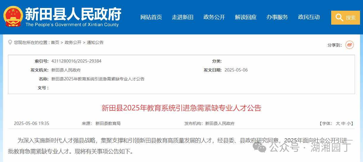 新田县2025年教育系统引进急需紧缺专业人才公告在新田县人民政府网、新田智慧教育云平台发布。报名、考试、体检、考察、公示、聘用等环节的信息,在同步官方媒体发布,由考生自行查阅,不另行通知。