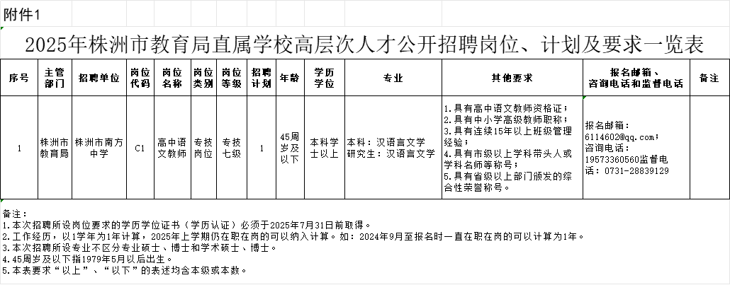 为进一步加强学校人才队伍建设,优化队伍结构,根据《事业单位人事管理条例》(中华人民共和国国务院令第652号)、《湖南省事业单位公开招聘人员办法》(湘人社规〔2025〕1号)等有关规定,经研究,2025年株洲市教育局直属学校面向社会公开招聘高层次人才1名。现将有关事项公告如下: