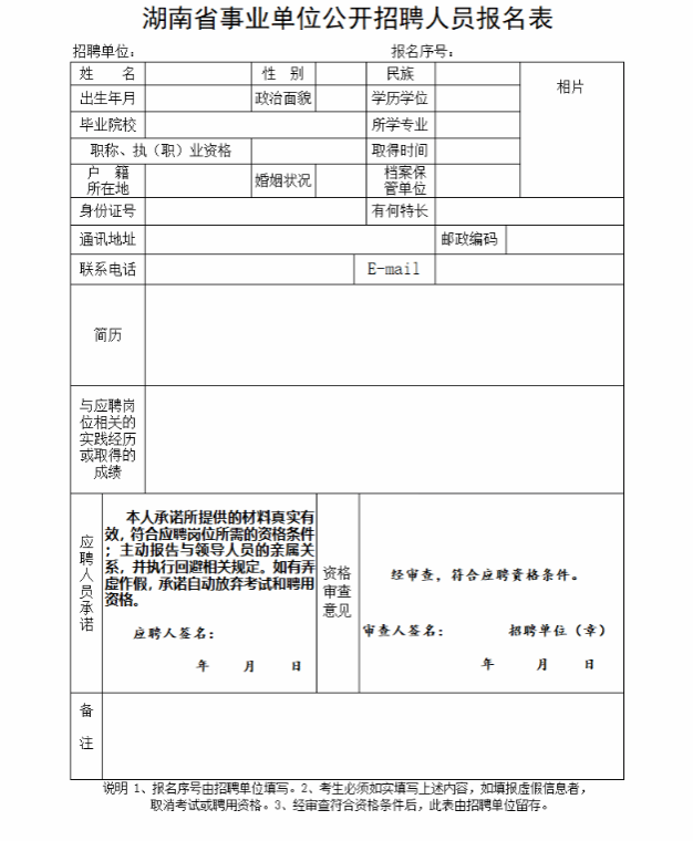 采取现场报名方式,每个考生限报一个岗位。报名时须提供本人有效居民身份证、毕业证(2025年应届毕业生提供《毕业生就业推荐表》)、学位证(2025年应届毕业生提供《毕业生就业推荐表》)、《教育部学历证书电子注册备案表》(2025年应届毕业生提供《教育部学籍在线验证报告》)及岗位要求的其他相关证件原件及复印件和近期二寸免冠彩色照片3张,填写《湖南省事业单位公开招聘人员报名表》