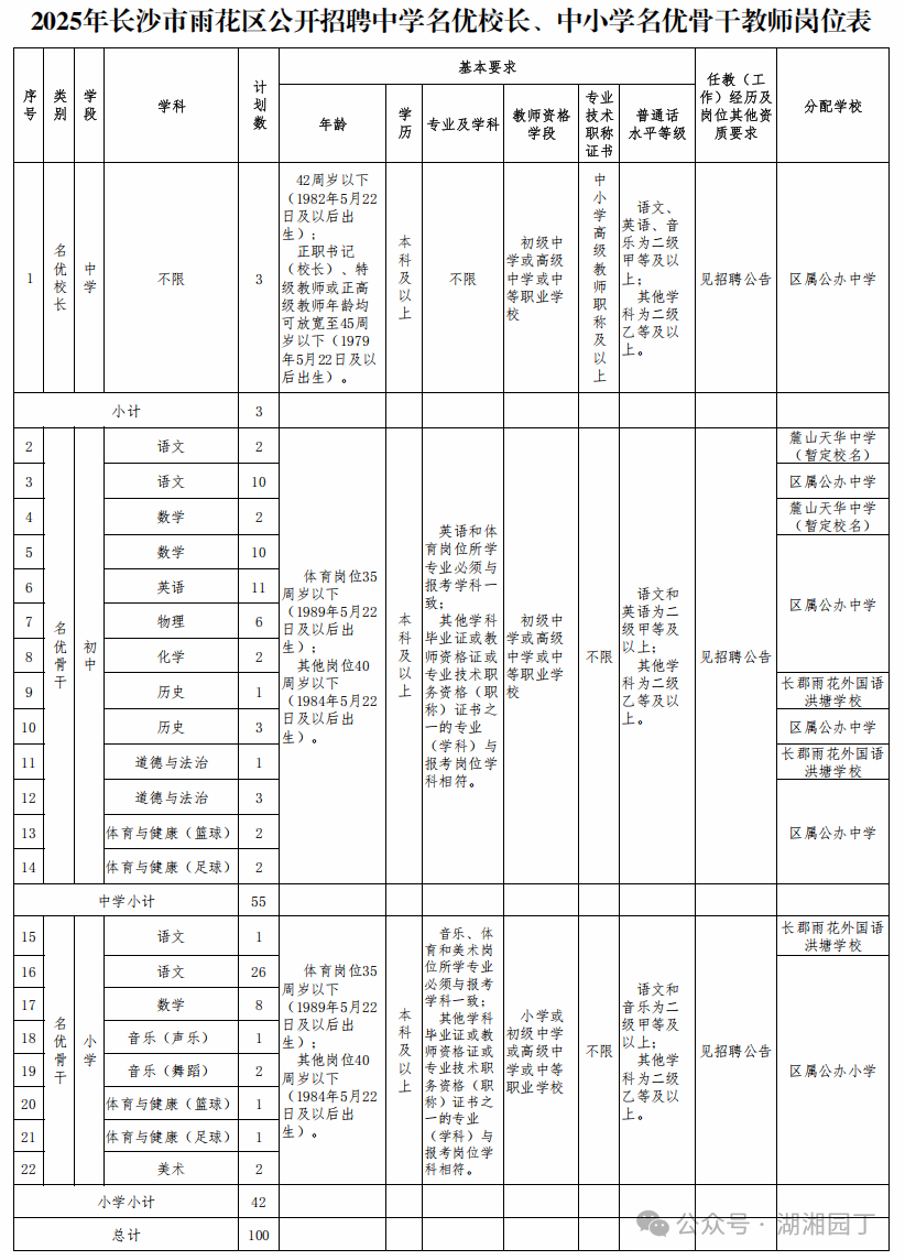 根据《事业单位人事管理条例》(国务院令第652号)、《关于进一步做好事业单位公开招聘工作的通知》(人社部发〔2024〕57号)、《湖南省事业单位公开招聘人员办法》(湘人社规〔2025〕1号)等有关规定,经研究决定,面向社会公开招聘中学名优校长、中小学名优骨干教师100名,其中中学名优校长(含正、副职,下同)3名,中小学名优骨干教师97名(含小学教师42名、初中教师55名)。现将有关事项公布如下: