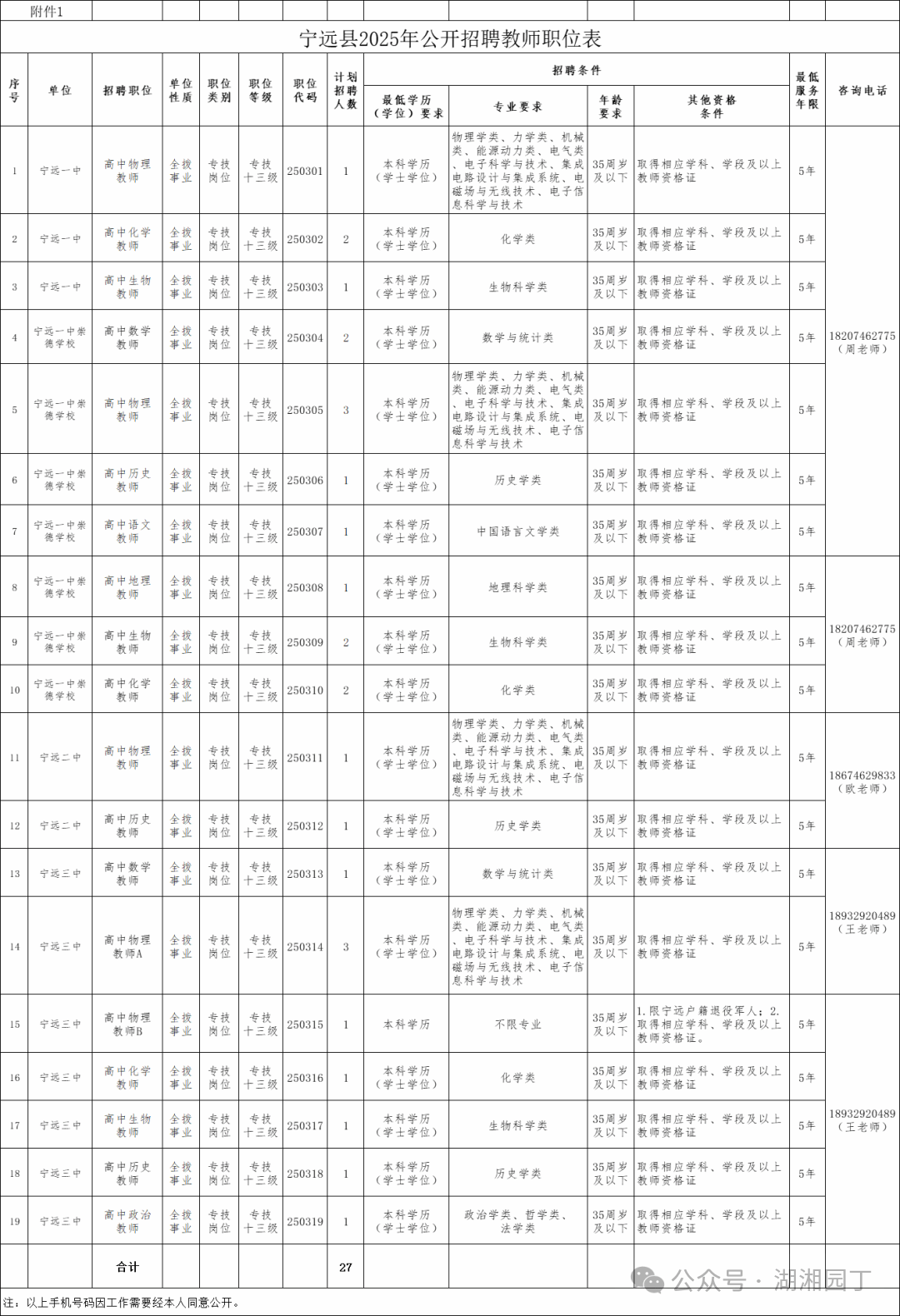 公开招聘职位共19个,计划招聘人员共27名,其中宁远一中4名、宁远一中崇德学校12名,宁远二中2名、宁远三中9名。