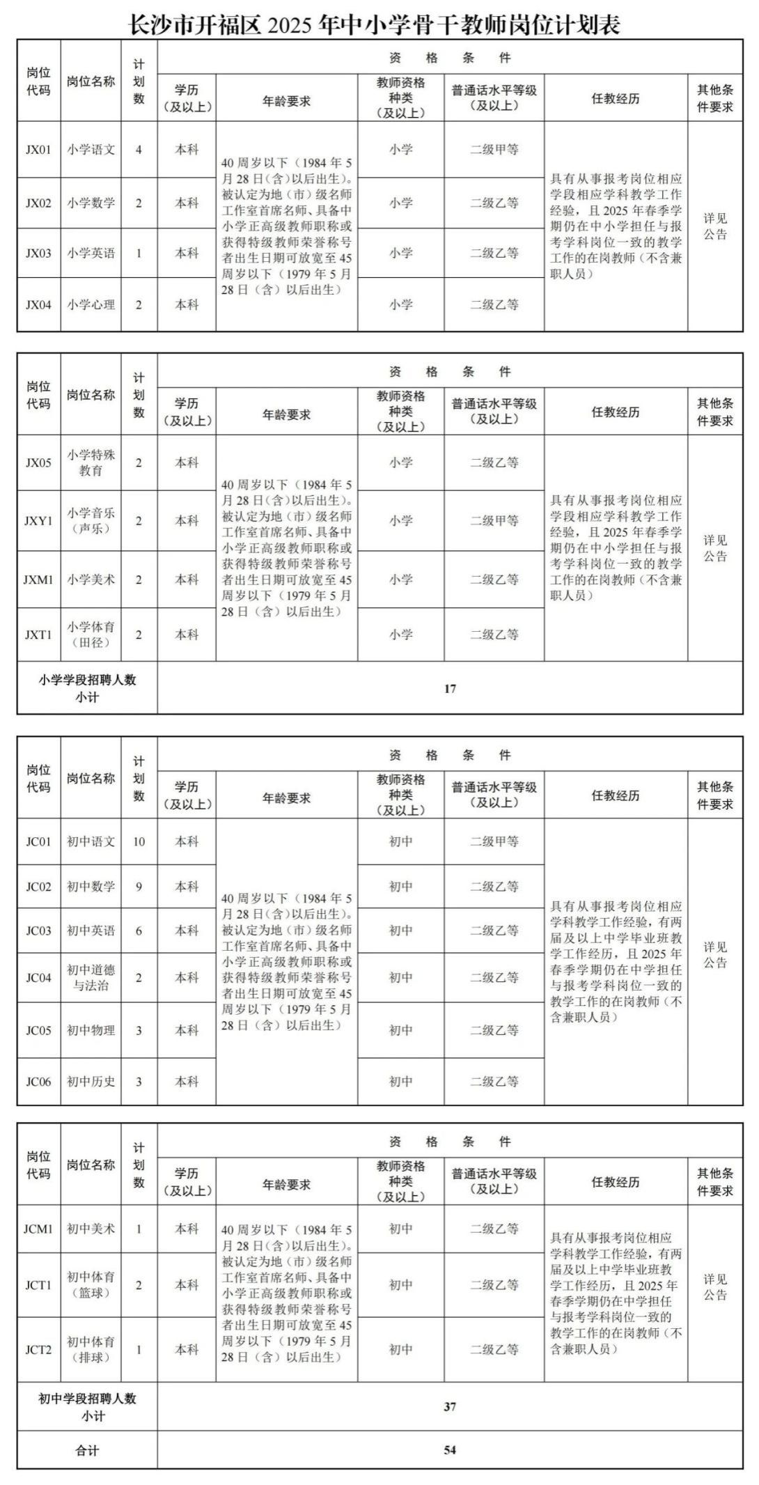根据《事业单位人事管理条例》(国务院令第652号)《湖南省事业单位公开招聘人员办法》(湘人社规〔2025〕1号)文件精神,为进一步促进开福教育事业发展,落实教师卓越工程,着力打造“优质教育资源聚集区”,争创国家义务教育优质均衡发展区。经区委、区政府研究,决定面向社会公开招聘中小学骨干教师54名(其中小学骨干教师17名,初中骨干教师37名)。现将开福区2025年公开招聘中小学骨干教师有关事项公告如下:
