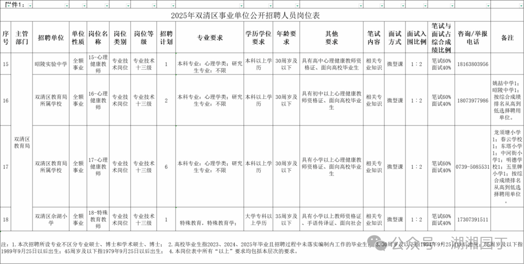 根据《事业单位人事管理条例》(中华人民共和国国务院令第652号)、《湖南省事业单位公开招聘人员办法》(湘人社规〔2025〕1号)、《邵阳市事业单位公开招聘人员实施细则》(邵人社发〔2019〕54号)和《关于修订印发〈邵阳市随军家属就业安置办法〉(试行)的通知》(邵市政发〔2022〕6号)等文件精神,邵阳市双清区所属事业单位面向社会公开招聘40名事业编制人员(具体岗位及要求见附件1),整个招聘工作按照制定方案,通过发布公告,现场报名、资格审查、笔试、面试、体检、考察、公示、聘用等步骤进行。查询相关信息请登录邵阳市双清区人民政府网查询(http://www.shuangqing.gov.cn)