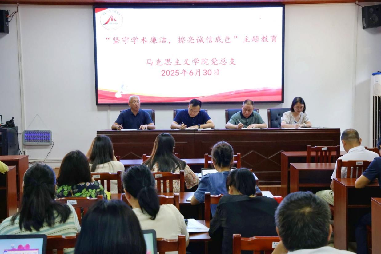 6月30日,马克思主义学院党总支在若谷楼116召开“坚守学术廉洁,擦亮诚信底色”主题教育活动,学院领导班子及全体教师参加,会议由党总支副书记阳青主持。