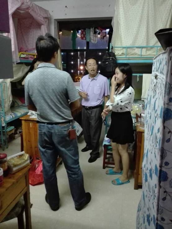 为了进一步了解学生的住宿情况,以及提高住宿学生的安全意识。2017年9月28号晚上我院领导游训龙书记、范大平院长、陈灿芬副院长、杨国辉副院长以及教工党支部书记符长喜老师、17级思政班班主任孙树文老师、辅导员张得才老师等在学生干部的带领下分批、分年级对我院学生宿舍进行安全隐患大排查。