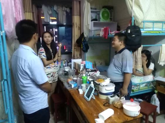 本网讯(通讯员 肖国伟)9月4日晚,在beat365开学之际,我院副院长杨国辉及辅导员张得才来到女生18栋、4栋、9栋,男生阳光三栋、六栋宿舍楼进行宿舍大排查。