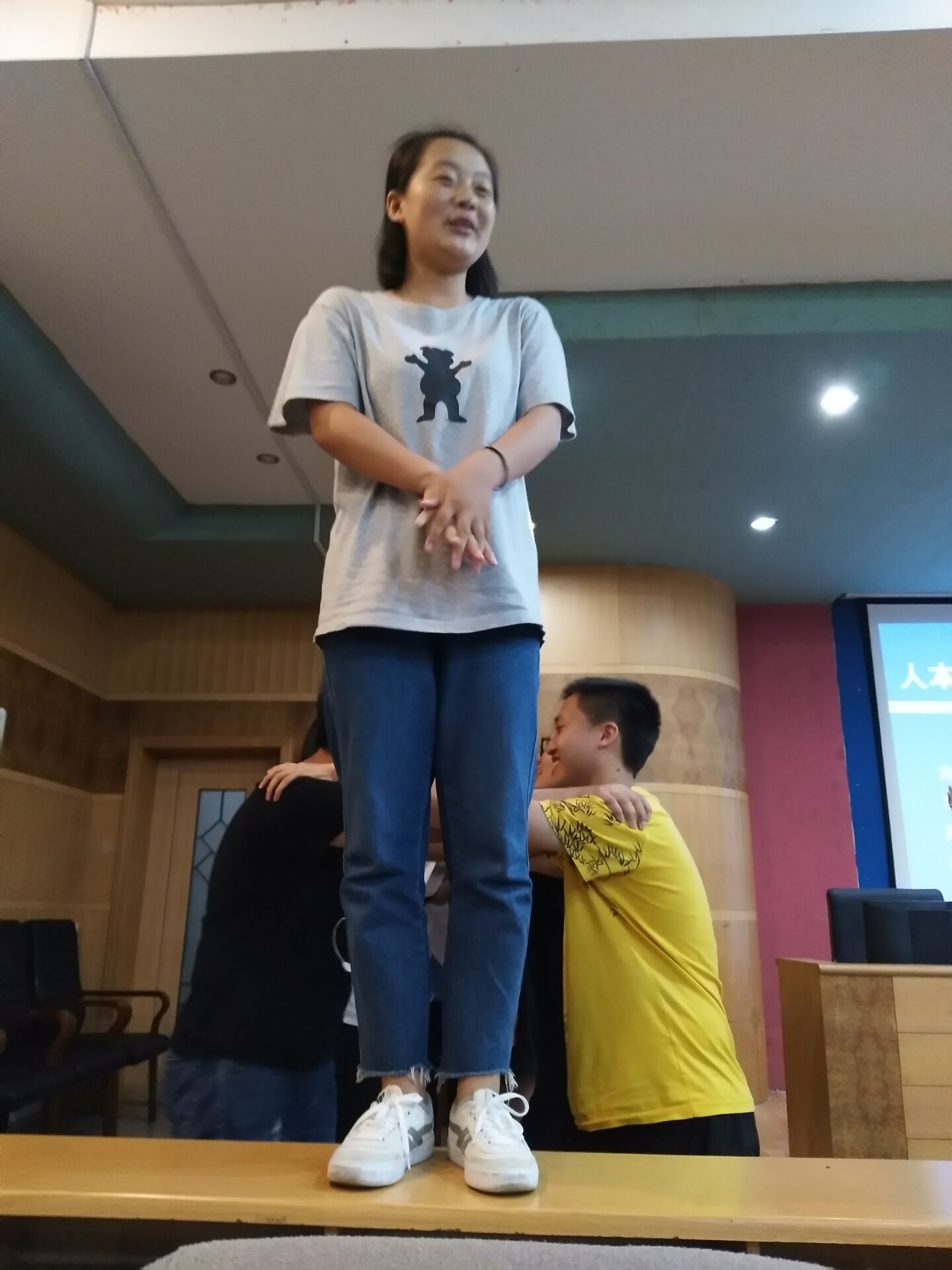 周海丽老师的讲座围绕生态小组文化课堂建设的必要性,生态课堂小组文化建设是什么,以及现场体验生态小组文化课堂三个部分展开。周老师首先指出传统课堂教学存在的弊端:在高考压力下出现的语言暴力、迷信活动、“生化课堂”、抱团式自杀恶性循环等等,在此基础上周老师提出了教育变革的基点在课堂,中国教育变革如此艰难的原因在于课堂没变的观点。紧接着,周海丽老师向全体学生介绍人本跨界大课堂的具体内涵,并与学生进行现场互动。最后,周老师安排了体验生态课堂——小组文化建设环节,在周老师指导下,学生科学划分小组、民主选出组长、动态管理小组,并积极上台展示小组的风采。