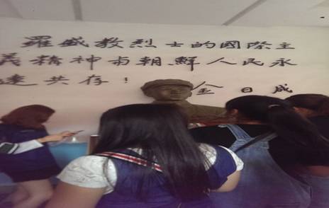 同学们在纪念馆内瞻仰烈士石像观看朝鲜领导题字