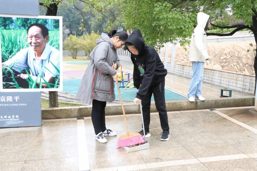 通过前几次的"守望花田"活动,同学们积累了许多经验,能更有效率地打扫干净负责区域。我院负责区域卫生死角较多,其中最棘手的当属拔除灌木丛下的杂草。但同学们并没有退缩,贯彻不怕苦、不怕累的劳育原则,迎难而上,集体协作,充分体现了"众人拾柴火焰高"的精神。