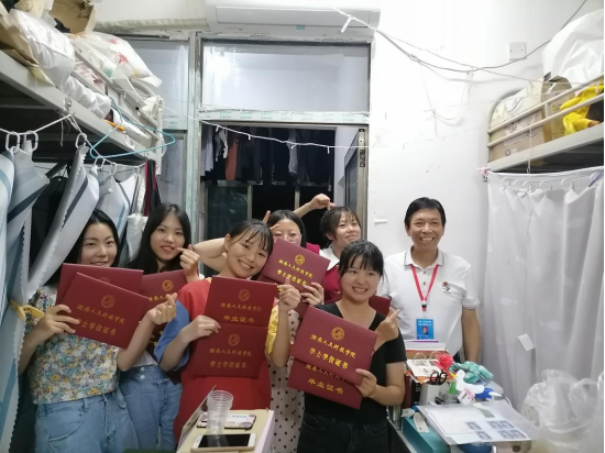 随后,郭军同志带队来到毕业生寝室,他详细询问了毕业生返校是否顺利,自我防护是否到位,“找到工作没有?”“在哪里就业?”“今后有和打算?”等等。我院毕业生也纷纷向郭军书记汇报就业情况,在听说同学们大都考上研究生、编制教师、民办教师等情况后,郭军书记非常高兴,并向毕业生们表示祝贺。他希望毕业生们在疫情自我防护的同时,克服困难,与祖国同行。希望毕业生们前程似锦、家庭幸福,拥有美好的未来。希望毕业生们在疫情结束之后,常回家看看。同时,郭军书记还高兴地为毕业生颁发毕业证和学位证并合影留念。活动之后,毕业生们纷纷表示,“没想到郭军书记会亲自来关心我们,还给我们补齐毕业证和学位证颁发仪式”,“郭军书记好有爱”,“爱了爱了,我的人文,我的马院”。