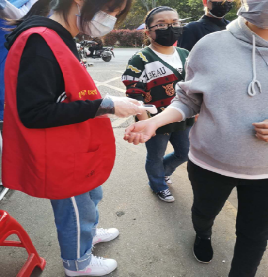 她参与服务的地点是重点管理区域——中兴市场。志愿者服务工作时间是早上八点到下午一点以及一点到下午六点这两个时间段进行轮换,由于家距离服务点较远,需要每天坐四十多分钟的公交车才能按时赶到,不过她并没有因此而放弃。初到了解情况后便开始了工作。面对人流量大且人口密集的公共市场,逐一测量体温是工作的重中之重,在测量体温的同时还需严格阻止外来车辆的进入以及市场内部机动车辆的驶出。除此之外,还需对市场内摊贩摆点处进行相关检查。