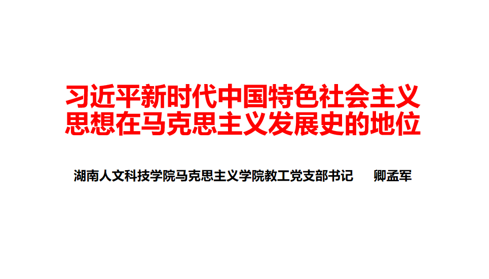 卿孟军博士从习近平新时代中国特色社会主义思想是信息化时代的马克思主义、习近平新时代中国特色社会主义思想开辟马克思主义新境界、习近平新时代中国特色社会主义思想是以“人类命运共同体”为核心概念的科学体系、习近平新时代中国特色社会主义思想展示了世界社会主义运动复兴的光明前景等四个方面阐述了习近平新时代中国特色社会主义思想在马克思主义发展史的地位。