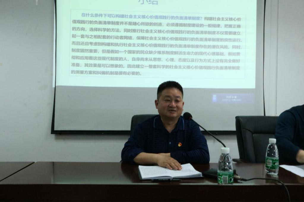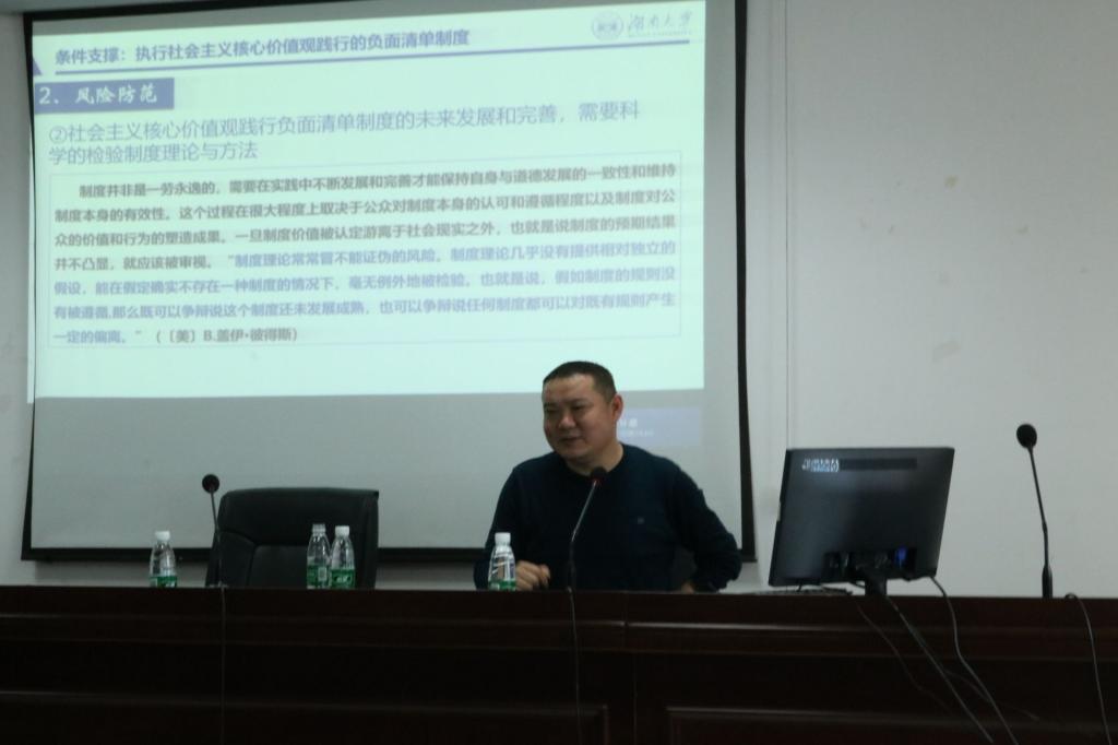 3月28日下午,青年长江学者、湖南大学马克思主义学院博士生导师吴增礼教授应邀在图书馆415学术交流中心为我院作了题为“社会主义核心价值观践行的负面清单制度构建研究”的讲座。此次讲座由我院副院长杨国辉博士主持,我院团总支书记张得才、20级全体同学及青马工程(骨干)培训班全体学员参加。