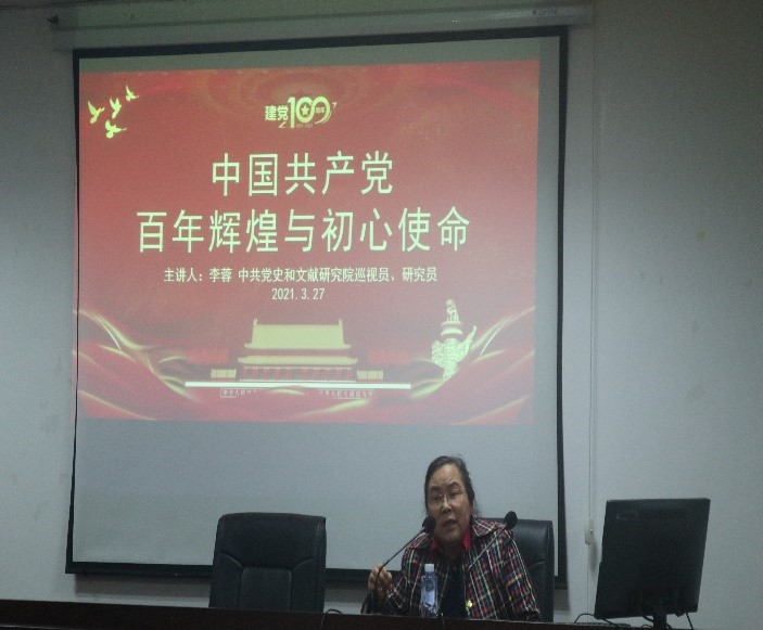李蓉教授以史为纲,以中国共产党发展过程中的重大历史事件为脉络,回顾了中国共产党取得革命胜利、带领全国人民走上社会主义建设道路,带领中华民族走向伟大复兴的艰难历程。她饱含深情地从宏观的历史节点讲到微观的历史故事,阐述了共产党人在无比艰难的时刻从来没有放弃过斗争,涌现出了诸如赵一曼、杨靖宇、瞿秋白、方志敏、蔡和森、向警予等等有着强烈爱国情怀和奋斗精神的革命烈士。李蓉教授还结合了新中国成立以来,中国共产党与新中国休戚与共的奋斗历程,论述了只有中国共产党才能带领中国人民走向幸福、带领中国人民走向繁荣富强,实现中华民族伟大复兴的中国梦。报告末尾,李蓉教授引用习近平总书记的话勉励全体人员:希望处于当今时代的我们,能做一个“政治强,业务精,纪律严,作风正”的人,不忘过去,牢记使命,开拓创新,为我国更加美好的明天不断奋斗。
