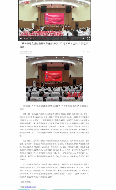 3月28日,湖南日报·新湖南客户端以《“蔡和森建党思想暨蔡和森诞辰126周年”学术研讨会举行 吴建平出席》为题报道了我院举办“蔡和森建党思想暨蔡和森诞辰126周年”学术研讨会的情况。3月28日,我院在beat365中文官方网站匠成楼多功能报告厅举行“蔡和森建党思想暨蔡和森诞辰126周年”学术研讨会。此举引起了湖南日报·新湖南客户端报道的关注,并派出记者进行采访。