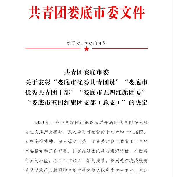 为表彰先进,选树典型,进一步激励全市广大团员、团干部和基层团组织奋发有为、再创佳绩,日前,共青团娄底市委下发2020度关于表彰“娄底市优秀共青团员”“娄底市优秀共青团干部”“娄底市五四红旗团委”“娄底市五四红旗团支部(总支)”的决定。马克思主义学院团总支获2020年娄底市“五四红旗团支部(总支)”称号。