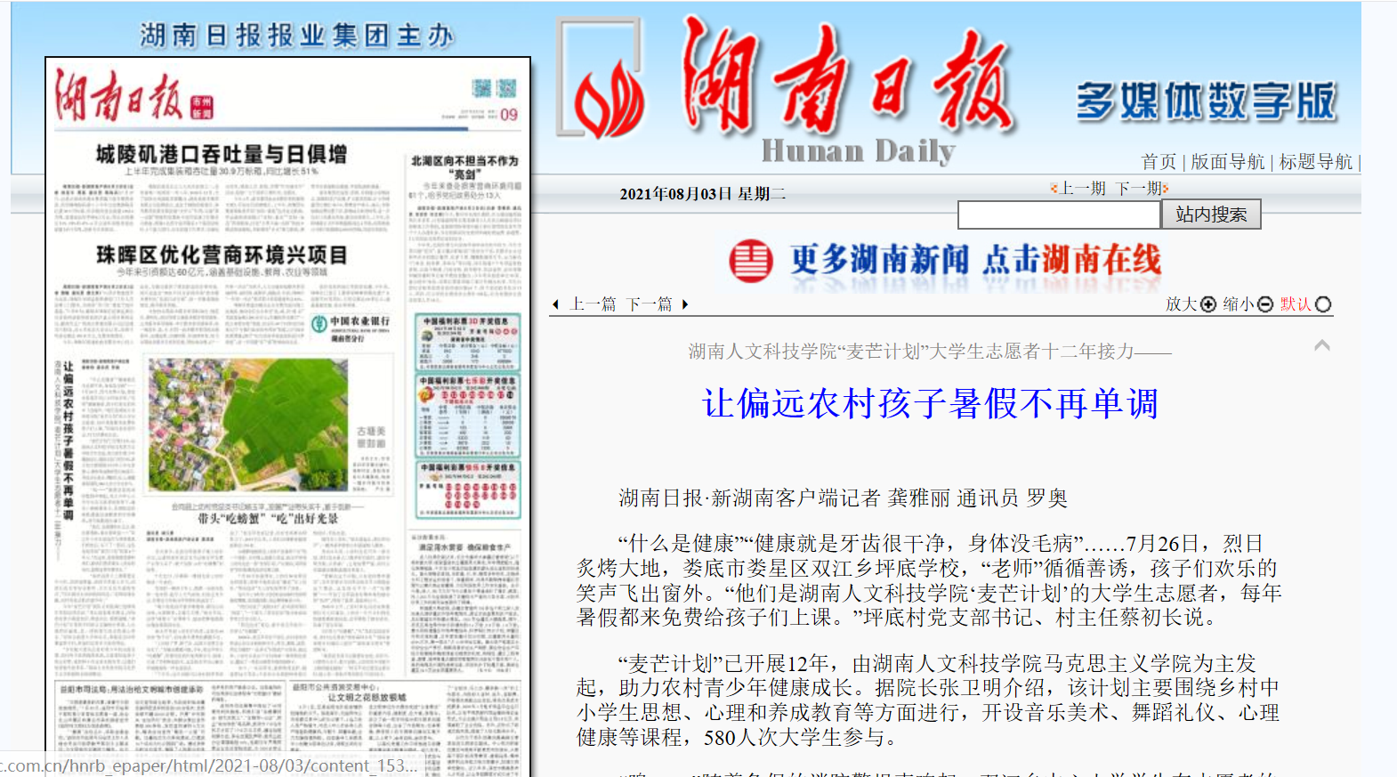《湖南日报》8月3日09版市州要闻专栏以《beat365中文官方网站'麦芒计划'大学生志愿者十二年接力——让偏远农村孩子暑假不再单调》为题报道我院"麦芒计划"。
