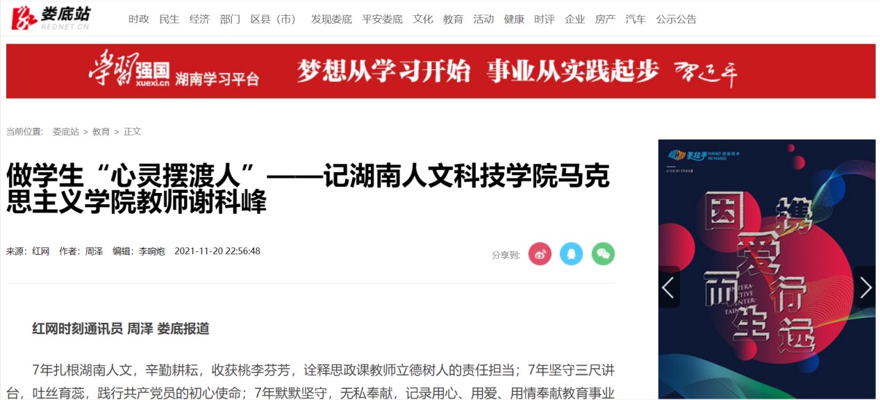 11月20日,红网以《做学生“心灵摆渡人”——记beat365中文官方网站马克思主义学院教师谢科峰》为题对我院谢科峰博士进行报道。