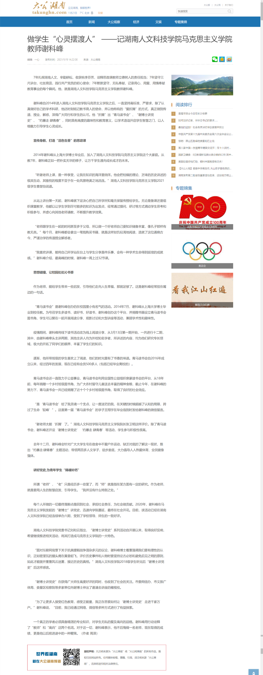 该报道从言传身教,打造“活色天香”的思政课、思想碰撞,让校园处处泌书香、讲好党史,为青年学生“铸魂补钙”三个方面生动详细地讲述了谢博士自2014年进入我院后,用心、用爱、用情奉献教育事业的每个瞬间。为号召学生多读书、读好书、好读书,谢博士创办了“青马读书会”,通过开展阅读分享、观影讨论和大型讲座等活动使得书香弥漫整个校园。此外,他还开设了“谢博士讲党史”、“约暴走·肆青春”等活动,活动开展以来,学生参与性高,并在学校及社会上取得了良好的反响。谢博士不仅具备精湛的专业知识,以学术造诣开启学生智慧之门,还满怀对学生无私的爱,以人格魅力引导学生心灵成长。他用行动诠释了“教师”和“高尚”两个名词,真正做到了传道、授业、解惑,成为学生们心中的“摆渡人”。