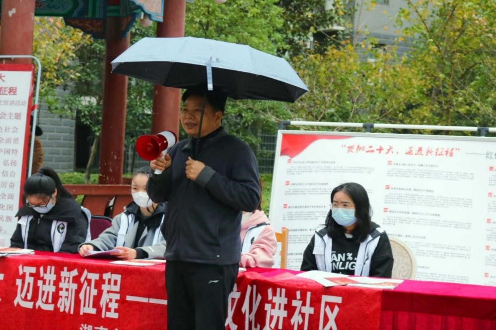 部分马院师生来到社区布置展区,并通过在社区内发传单和入户宣传的方式,让更多的居民学习领悟党的二十大精神。虽然天空下起了小雨,但宣讲团成员精神饱满,准备充分,很快吸引了许多社区居民驻足倾听。党委书记刘和云到场亲自指导,他强调:第一、中国共产党第二十次全国代表大会,是在全党全国各族人民迈上全面建设社会主义现代化国家新征程、向第二个百年奋斗目标进军的关键时刻召开的一次十分重要的大会,是一次高举旗帜、凝聚力量、团结奋进的大会。第二、广大党员干部要坚持把实现人民对美好生活的向往作为现代化建设的出发点和落脚点。第三、勉励同学们要结合自身的学习体会,用通俗易懂的语言宣讲党的二十大精神,推进党的二十大精神深入人心,在宣讲实践中进一步领悟党的二十大精神伟力,汲取前进力量,让青春在全面建设社会主义现代化国家的火热实践中绽放绚丽之花。